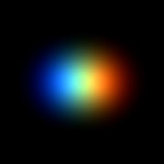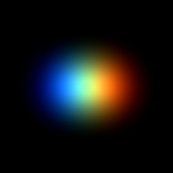 Once you have a basic shape you like, make two copies of the layer, so that you have a total of three, all the same. Then change the gradients so that one layer is pure red where it used to be white, one layer is green, and one layer is blue. Set all their merge modes to Screen or Addition. Now the light is being broken into its three primary components, and immediately re-combined, so the image should look exactly the same as it did when it was a single black-and-white layer.