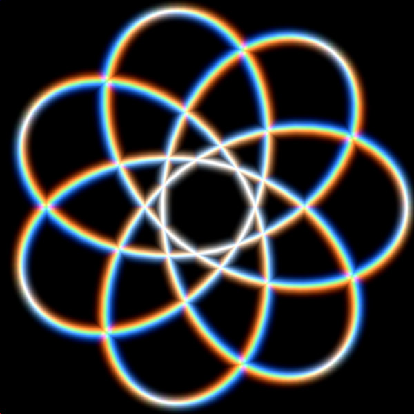 For the light to combine into lots of colors, instead of just white again, it needs to be mixed together in varying proportions. In other words, the brightest parts of each color layer need to not be directly on top of each other. One way to make that happen is to adjust the diameter of the ring trap. Here, I've made the red layer diameter larger, the blue diameter smaller, and left the green layer alone.